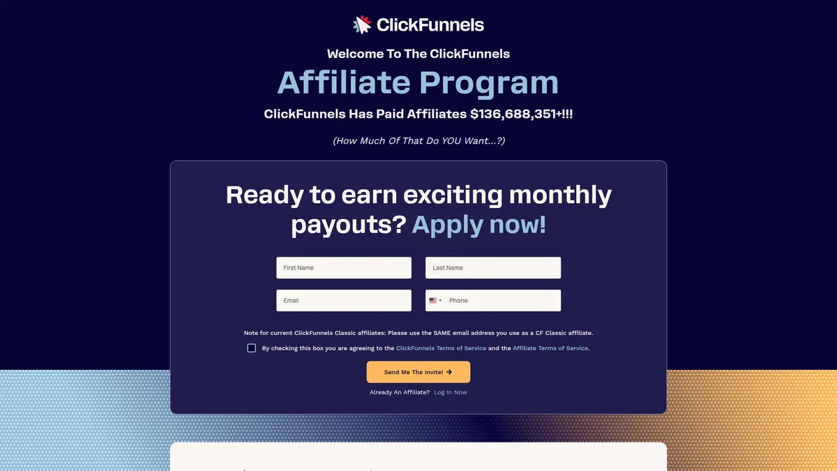 - 1Visit the ClickFunnels affiliate program page and click the application button