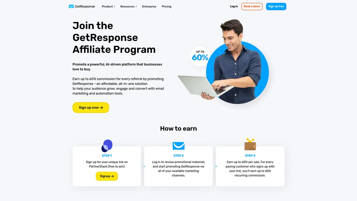 The GetResponse affiliate program runs through PartnerStack, a well-known affiliate platform. Once approved, you get access to a dashboard where you can generate unique tracking links, view your referral stats, and monitor your commission earnings. When someone clicks your affiliate link and signs up for a paid GetResponse plan, the 90-day cookie window tracks the conversion back to you.