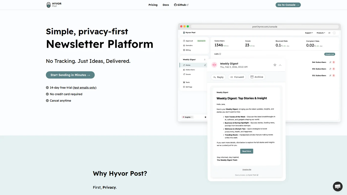 Privacy-first newsletter platform for creators who want simple, tracking-free email communication