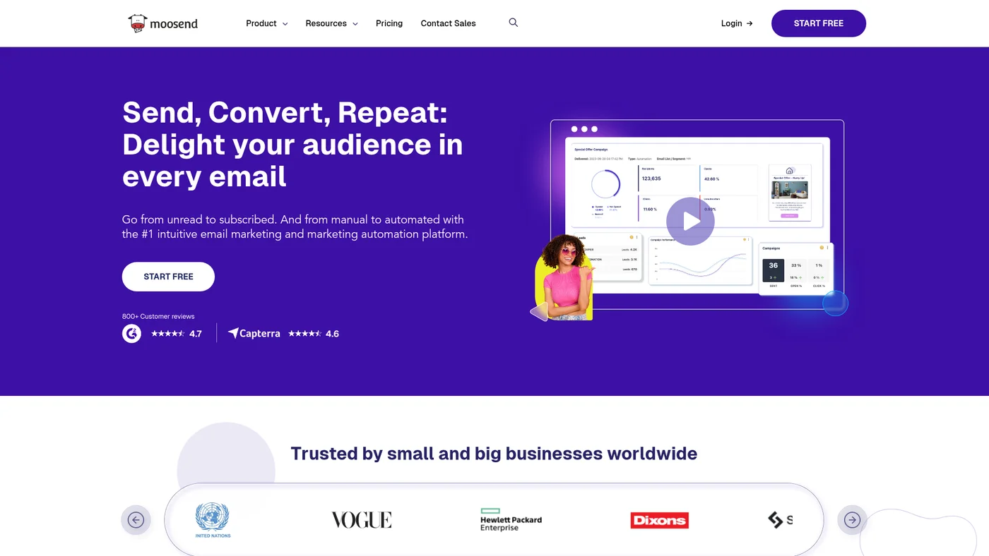 Drip and Moosend are specifically designed for e-commerce with advanced product recommendations and behavior tracking. ActiveCampaign also works well for online stores that need CRM features alongside email marketing.