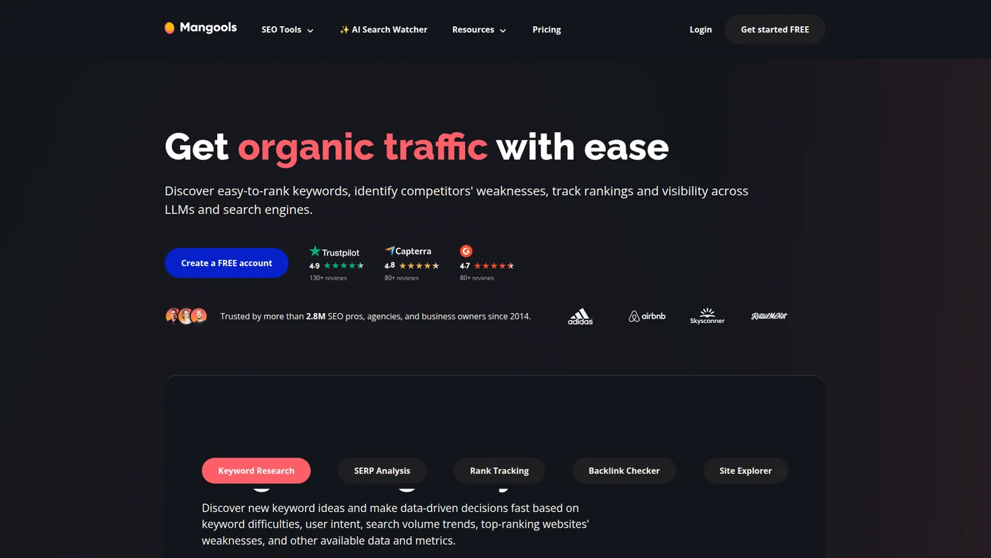 Mangools is an SEO tools suite offering keyword research, SERP analysis, rank tracking, backlink checking, and site profiling for SEO professionals.