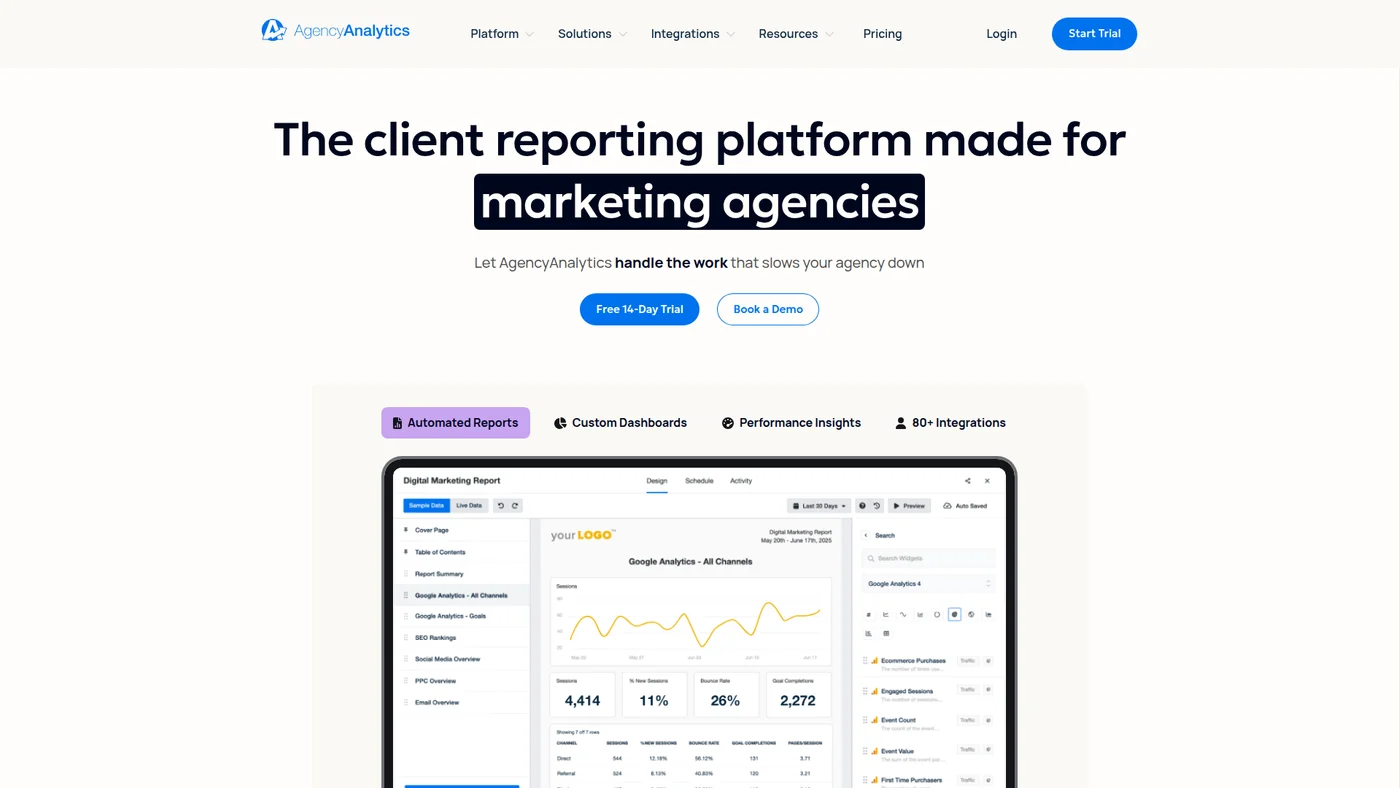 Marketing analytics platform for agencies offering automated reporting, custom dashboards, and client management with 80+ integrations.