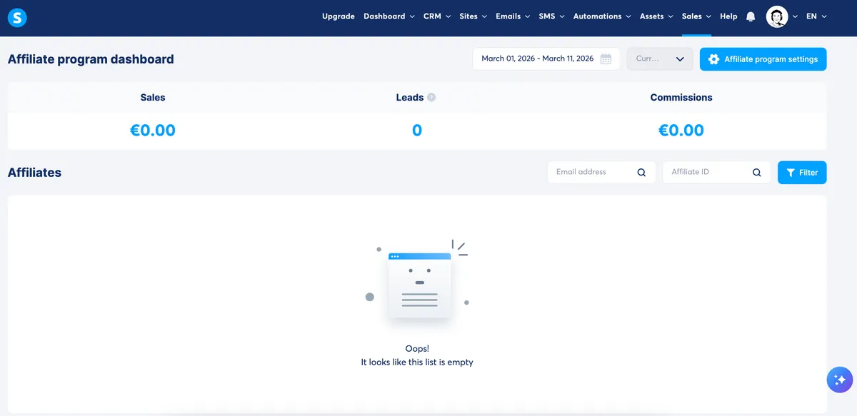 You can create and run your own affiliate program directly from the free plan. The affiliate dashboard gives you a complete overview of sales, leads, and commissions. You set up commission structures, manage individual affiliates, view performance reports, and handle payouts, all from one screen.