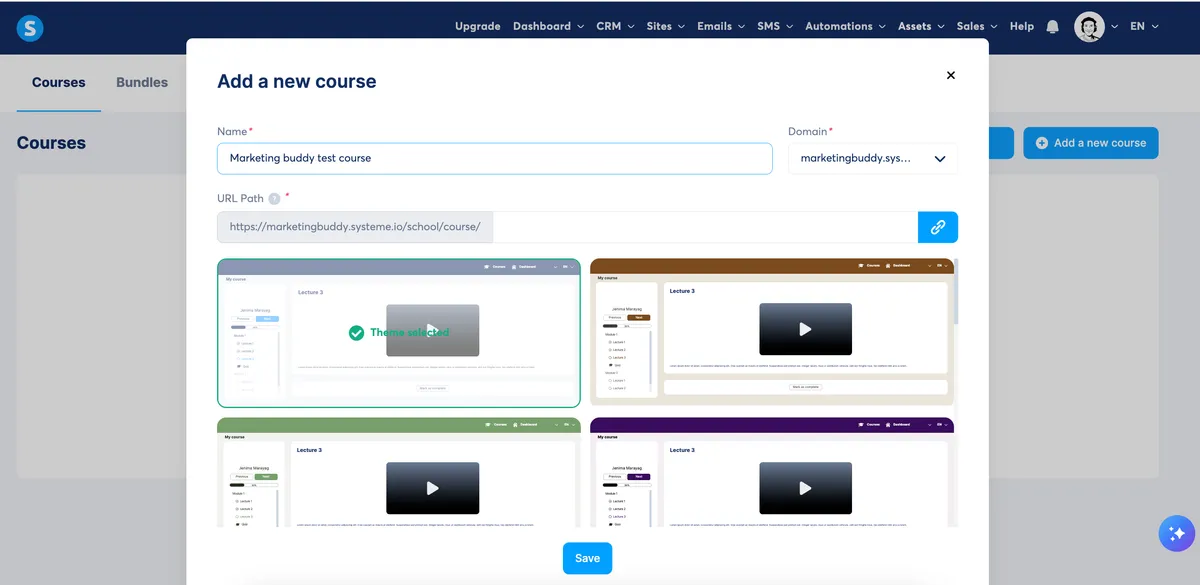 You can create and sell one online course with multiple modules and lectures. The course builder includes theme templates and hosts everything on a Systeme.io subdomain. For a web design studio creating a "DIY Website Basics" course or a fitness coach packaging workout programs, this is a real revenue stream at zero cost.