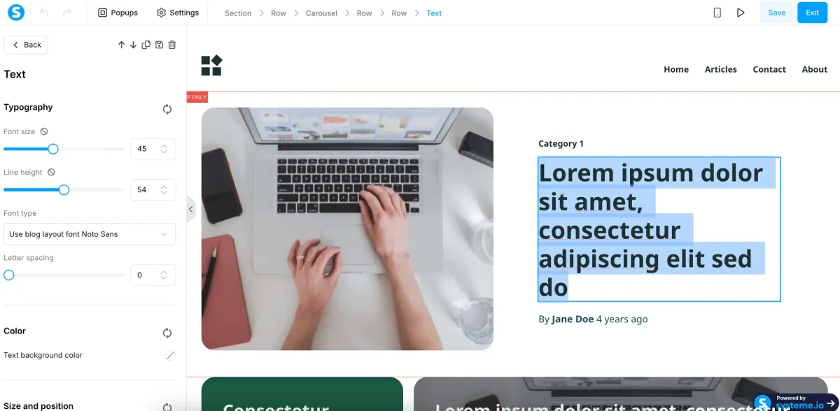 You can build one full website with multiple pages. The builder includes professional templates, and the drag-and-drop editor gives you solid control over layout with text blocks, headlines, images, video, audio, carousels, and column layouts.
