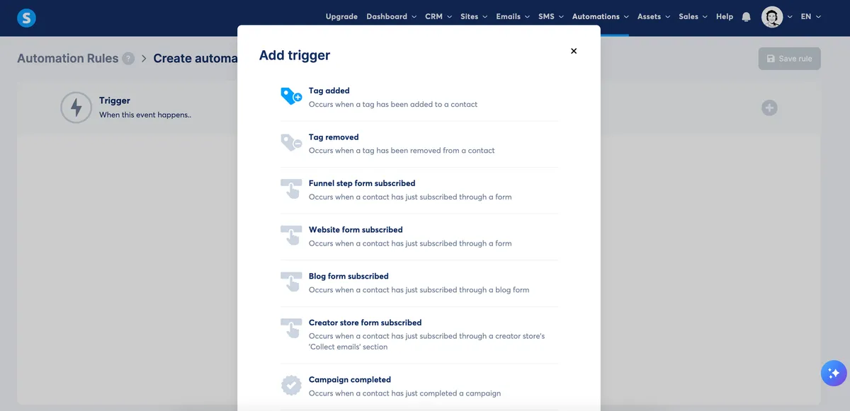 The automation builder is available on the free plan with no restrictions on the number of rules. Trigger options include tag-based actions, form submissions, campaign completions, webinar registrations, and more. You can automatically tag contacts, send emails, enroll people in courses, or move them through funnels based on their behavior.