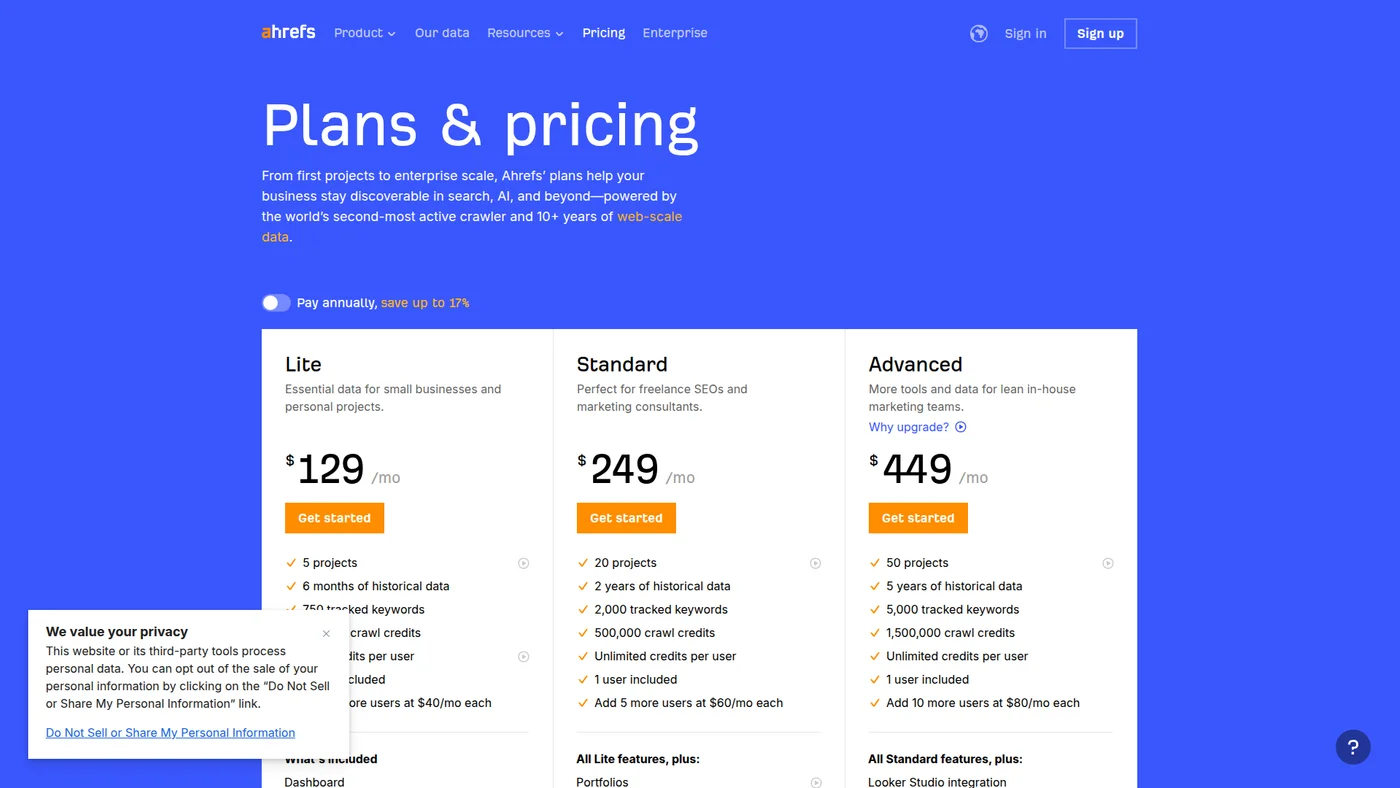 Ahrefs pricing starts at $129/month for the Lite plan, with no free trial available though they offer free Webmaster Tools for site owners. The Standard plan costs $249/month, Advanced runs $449/month, and Enterprise reaches $1,499/month with annual commitment required. Paying annually saves up to 17% across all plans.