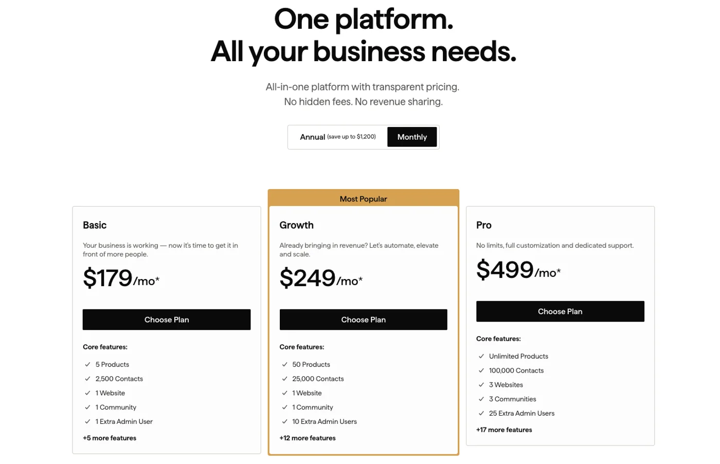 The Basic plan limits you to 5 products and 2,500 contacts, which works for most new users. Growth increases limits to 50 products and 25,000 contacts, plus adds advanced automations and API access. Pro offers unlimited products, 100,000 contacts, and includes the branded mobile app (normally $199/month extra).