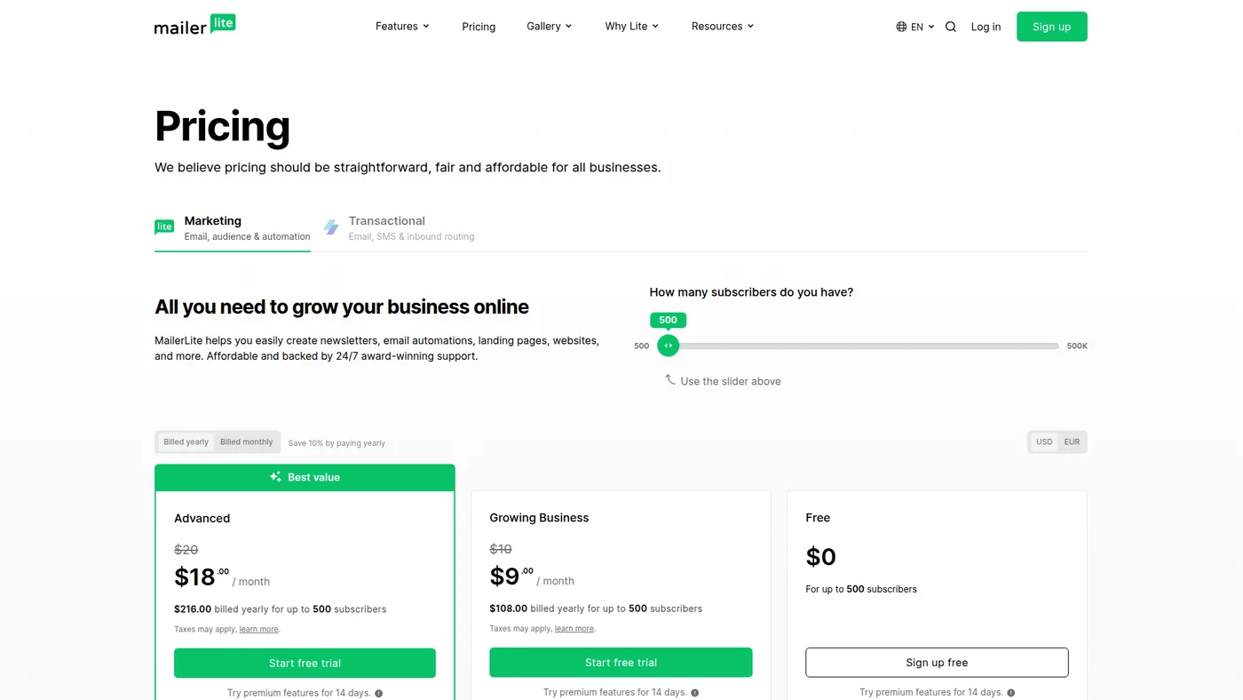 MailerLite starts at $10 per month for the Growing Business plan, which includes unlimited emails for up to 500 subscribers. The free plan allows up to 500 subscribers and 12,000 monthly emails, making it one of the more generous free tiers available. The Advanced plan at $20 per month adds features like smart sending and enhanced automations.