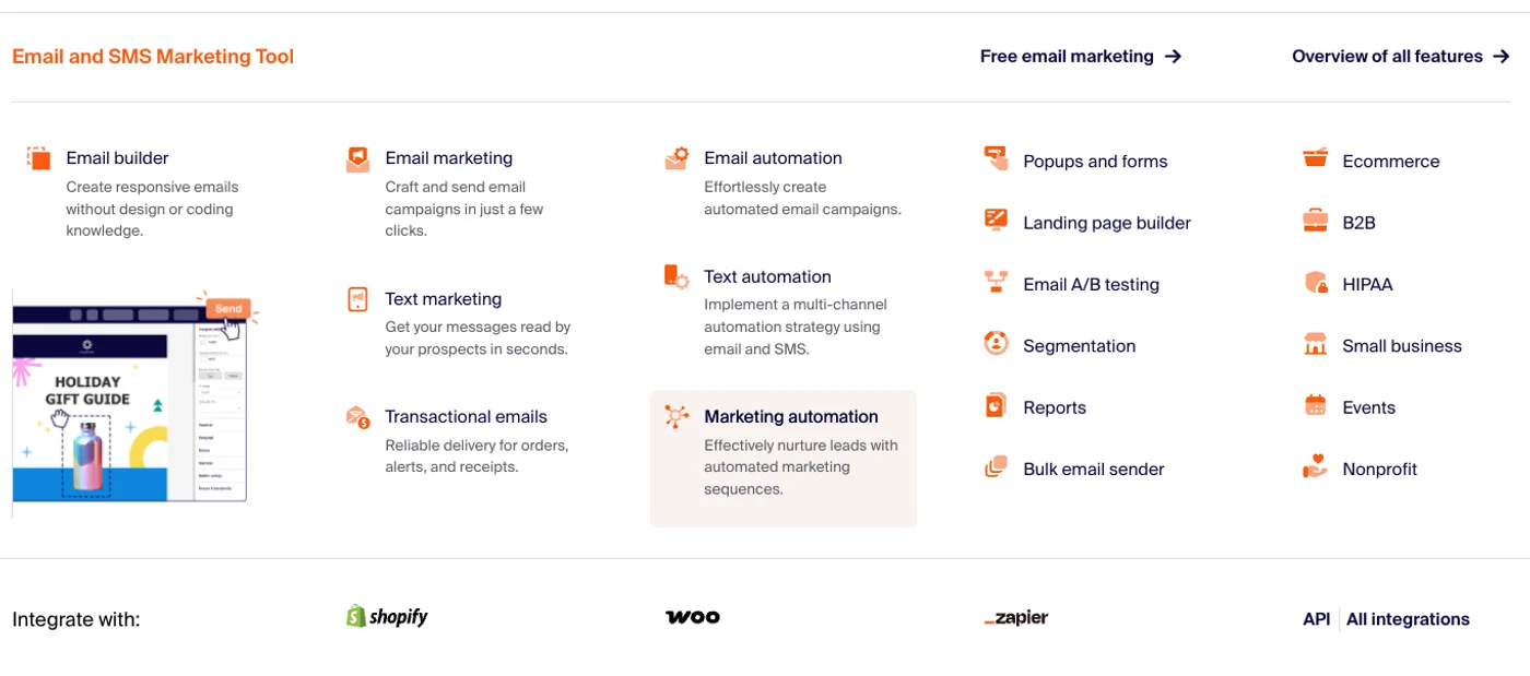 - ✓E-commerce Stores — Built-in Shopify, WooCommerce integrations make it ideal for online retailers needing abandoned cart sequences.