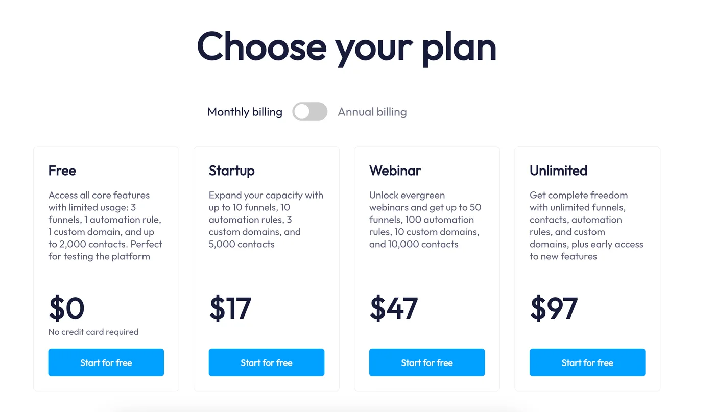 The Webinar plan at $47/month adds evergreen webinar functionality and increases limits to 50 funnels and 10,000 contacts. The Unlimited plan at $97/month removes all restrictions and includes advanced features like unlimited automation rules and custom domains.