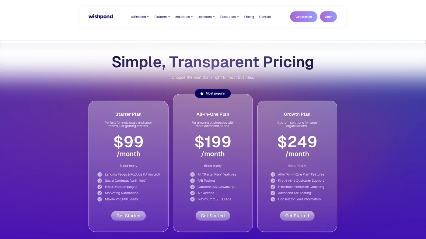 Wishpond's pricing starts at $99 per month for the Starter plan (billed annually), which includes unlimited landing pages and social contests but caps you at 1,000 leads. The All-In-One plan costs $199 monthly and increases your limit to 2,500 leads while adding A/B testing and API access. The Growth plan runs $249 monthly with priority support and advanced features.